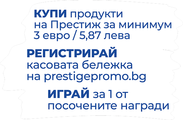 За участие в тегленето на 30 куфара или 30 смарт часовници, купи продукти на Престиж за минимум 3 евро / 5,87 лева и регистрирай номера на касовата бележка във формата по-долу. Визията на наградите е с илюстративен характер. В промоцията участват всички продукти с марка Престиж.